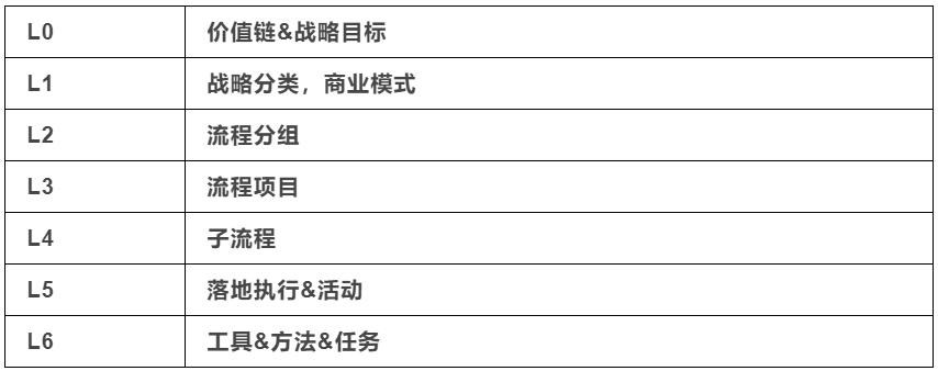 企业有现有组织,我们先看看目前比较公认的流程架构体系:可以分为L0-L6级。