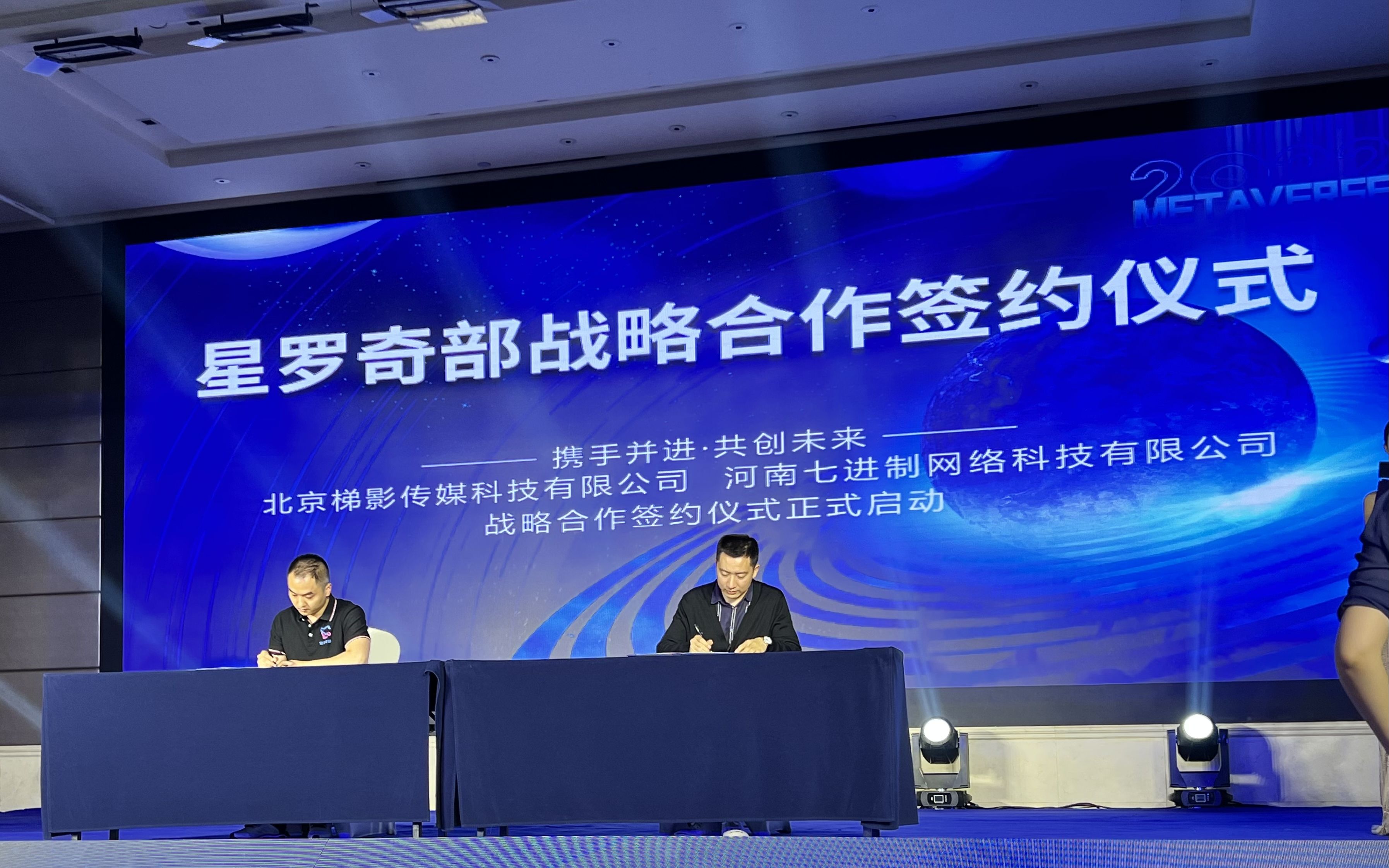 9月21日下午,北京梯影传媒科技有限公司创始人兼CEO任斌和河南七进制网络科技有限公司创始人高威签订战略合作协议,将在元宇宙广告领域展开合作。