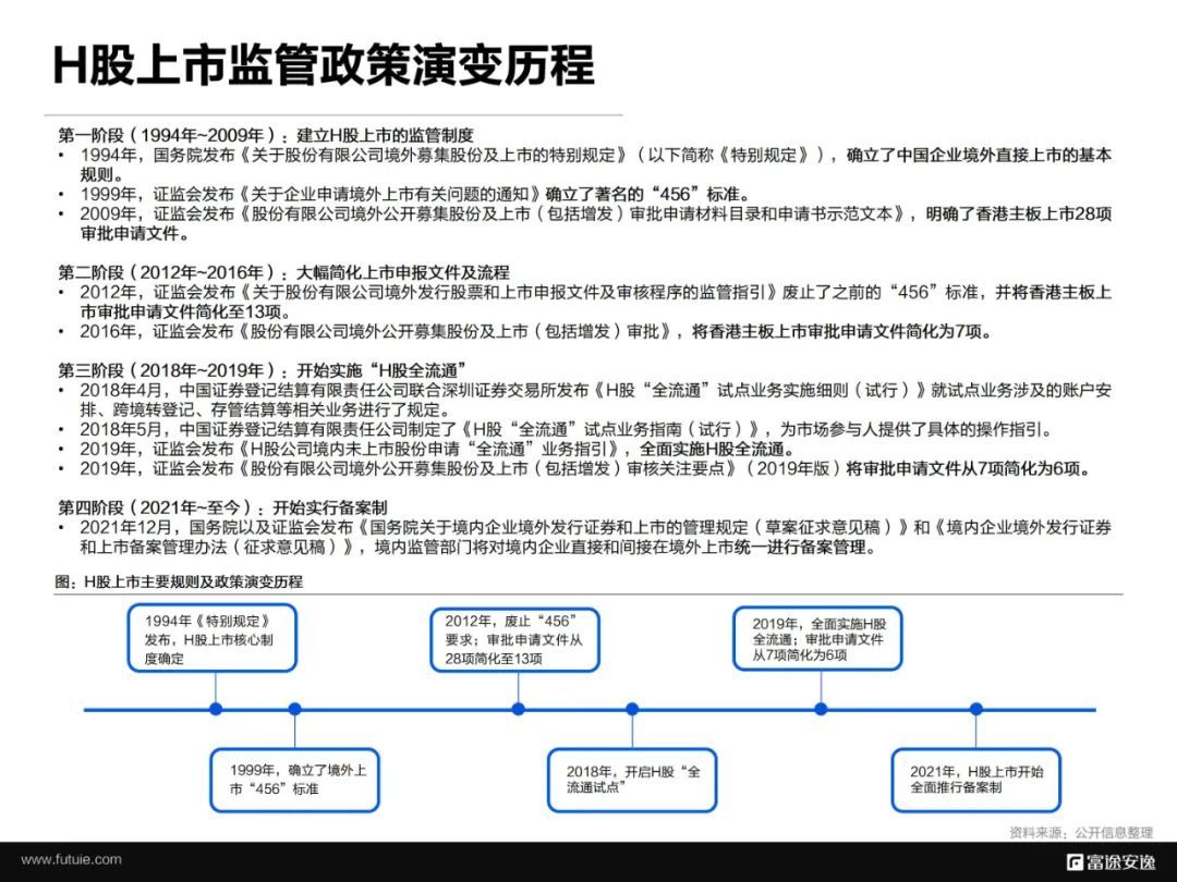 从H股监管演变历程来看,大体经历了 确立核心上市监管制度 - 简化审批程序 - 开启H股全流通 - 推行备案制 的四个阶段。随着我国金融市场制度的建立和完善,H股上市的监管流程和范围都更加清晰明确。