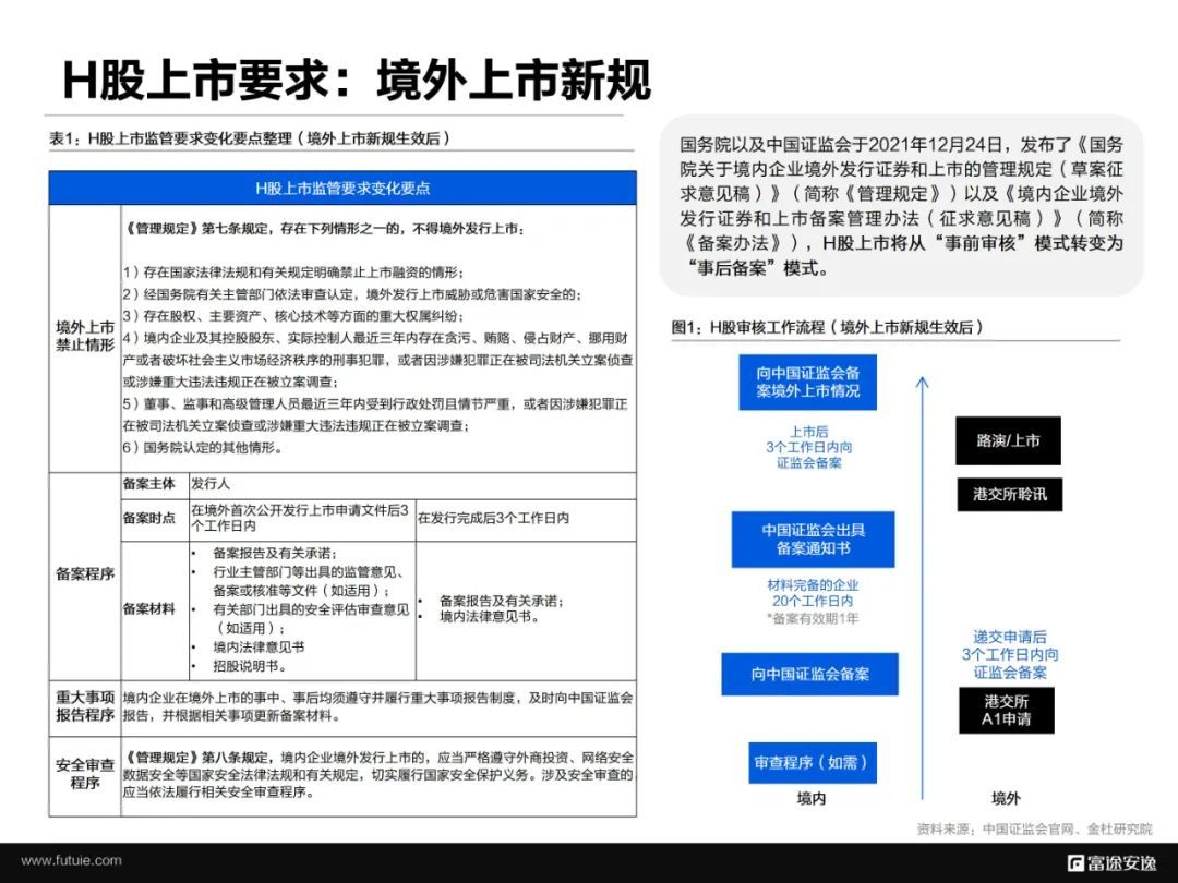根据国务院及中国证监会发布的《国务院关于境内企业境外发行证券和上市的管理规定(草案征求意见稿)》(简称《管理规定》)以及《境内企业境外发行证券和上市备案管理办法(征求意见稿)》(简称《备案办法》), H股上市将从“事前审核”模式转变为“事后备案”模式。
