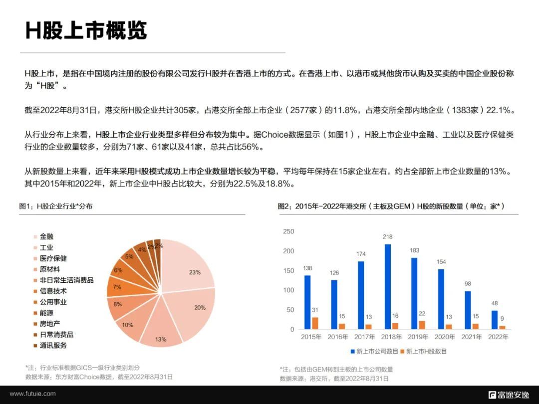 截至2022年8月31日,港交所H股企业共计305家,占港交所全部上市企业(2577家)的11.8%,占港交所全部内地企业(1383家)22.1%。