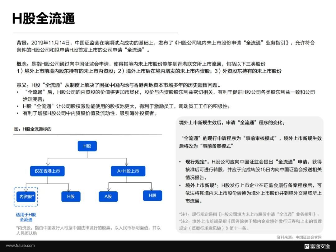 2019年,证监会发布《H股公司境内未上市股份申请“全流通”业务指引》, 全面实施H股全流通。