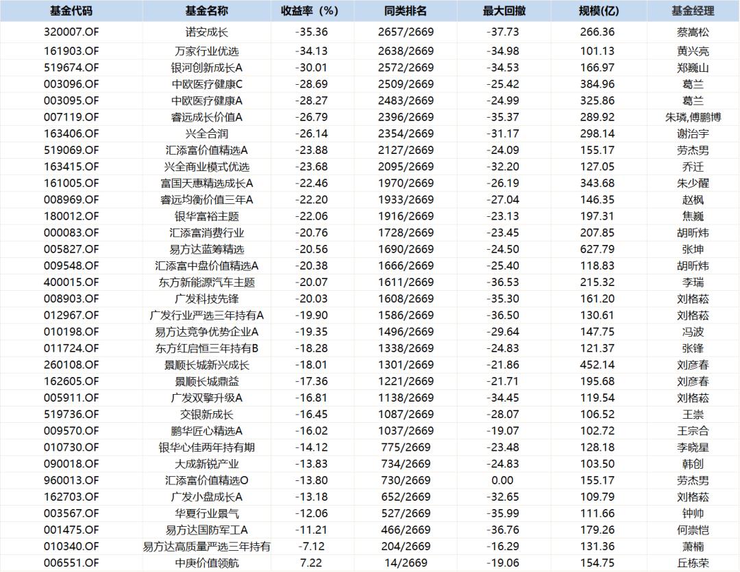 Wind数据显示,规模100亿元以上的偏股型基金中,年内回撤幅度最大的就是蔡嵩松的诺安成长,投资回报率仅有-35.36%。年内投资回报率低于-30%的还有万家基金旗下的万家行业优选和银河基金旗下的银河创新成长A。前者基金经理为黄兴亮,目前规模101.13亿元,年初至今收益率为-34.13%。后者基金经理为郑巍山,目前规模166.97亿元,年初至今收益率为-30.01%。