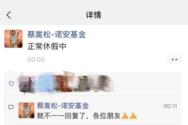 对于“失联”传闻,蔡嵩松深夜在个人微信朋友圈回应称“正常休假中”。9月21日午间,诺安基金正式回应称:“我司基金经理蔡嵩松目前在休假中,其管理的相关产品运作一切正常。”