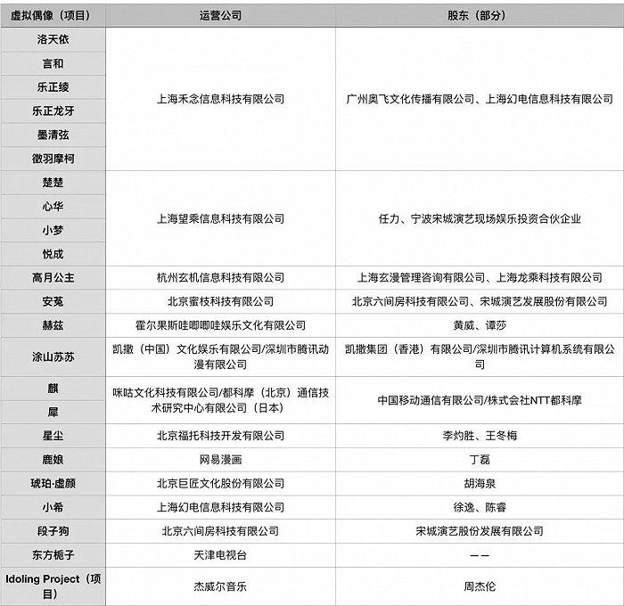 国内虚拟偶像名单(部分),数据来源:天眼查