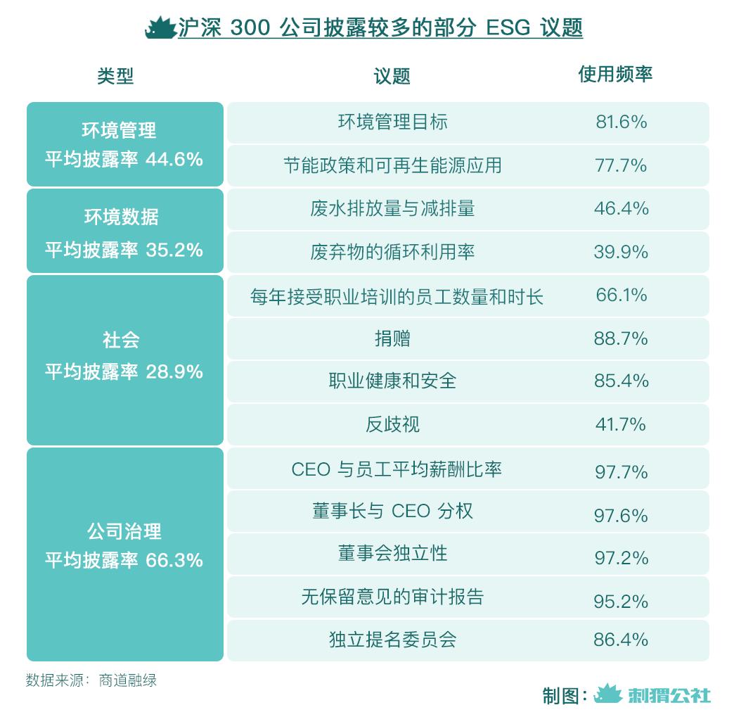 根据商道融绿对沪深300指数成分股发布的ESG报告情况的分析,我们可以看到企业ESG实践的覆盖面广: 在环境层面更关注环境管理,在社会层面较为重视社会公益、员工健康与安全等议题,而在公司治理层面,董事会独立性和薪酬等方面是重点。