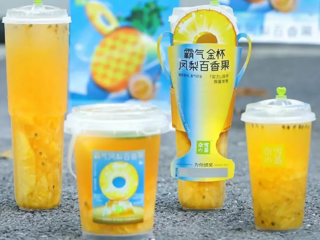上个月,奈雪上新了“霸气一桶凤梨百香果”,在杯中放置整片凤梨,加强“料多、划算”的消费认知。一起上架的还有超长凤梨杯“霸气金杯凤梨”,25厘米长的杯型,也增加了产品卖点。