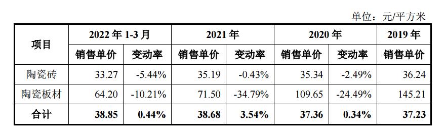 招股书数据显示,截至2022年第一季度,新明珠集团陶瓷砖和陶瓷板材销售均价分别为:33.27元/平方米、64.20元/平方米;变动率分别为:-5.44%、-10.21%。而这两组数值与2021年相比,降价幅度越拉越大。