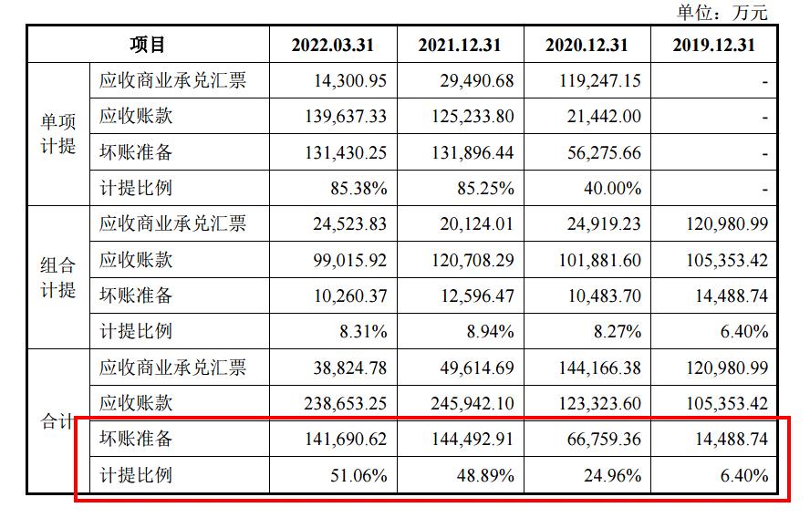 招股书显示,报告期内,公司应收款项坏账准备为1.45亿元、6.68亿元、14.45亿元、14.17亿元,计提比例为6.40%、24.96%、48.89%、51.06%。