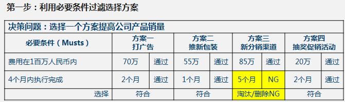 将决策的选择条件分为“必要条件”与“优先条件”。这个决策方法分为两步: