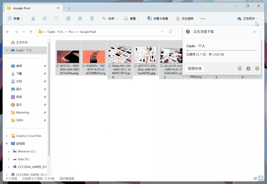 OneDrive 与资源管理器的整合也更加紧密。浏览 OneDrive 目录时,22H2 会在文件资源管理器右上角直接提供一个状态提示按钮,用于展示当前的 OneDrive 同步状态、容量空间使用情况以及管理、设置等常用操作跳转菜单。