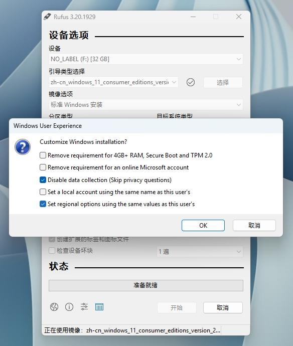 你可以从上一条的同一个页面下载媒体介质创建工具,然后用官方工具搞定启动盘创建。在这个流程中,同样也有MediaCreationTool这样的工具帮你度过 RAM 太小、TPM 门槛太高的难关。