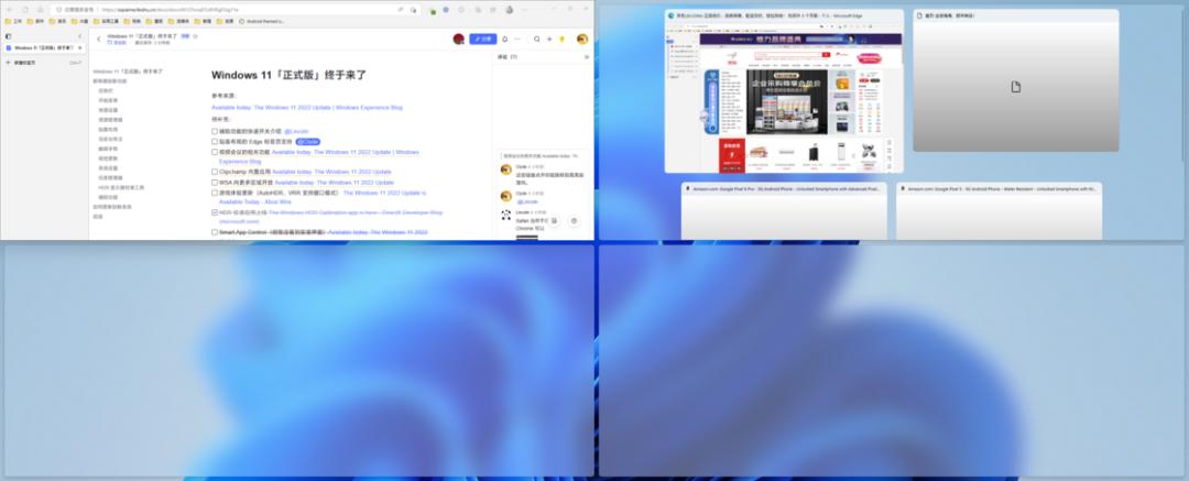 首先,和此前的多任务切换一样,贴靠布局在其中一个窗口完成贴靠时,其他窗口会依次出现在还没有窗口的贴靠区域中。而如果你使用的是 Edge 浏览器,那么 Edge 浏览器中的标签页此时也会以独立窗口的形式出现在建议区域,方便我们将多个浏览器标签页面同时排列在桌面上。