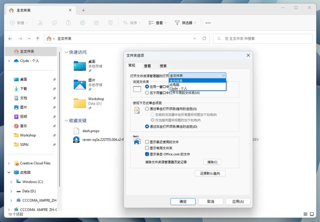 这里涉及到的改动是资源管理器「主文件夹」页面的引入,作为资源管理器新的默认启动页,主文件夹除了像以往那样提供快速访问、最近使用文件和常用文件夹外,现在还新增了一个名为「收藏夹键」的区域。