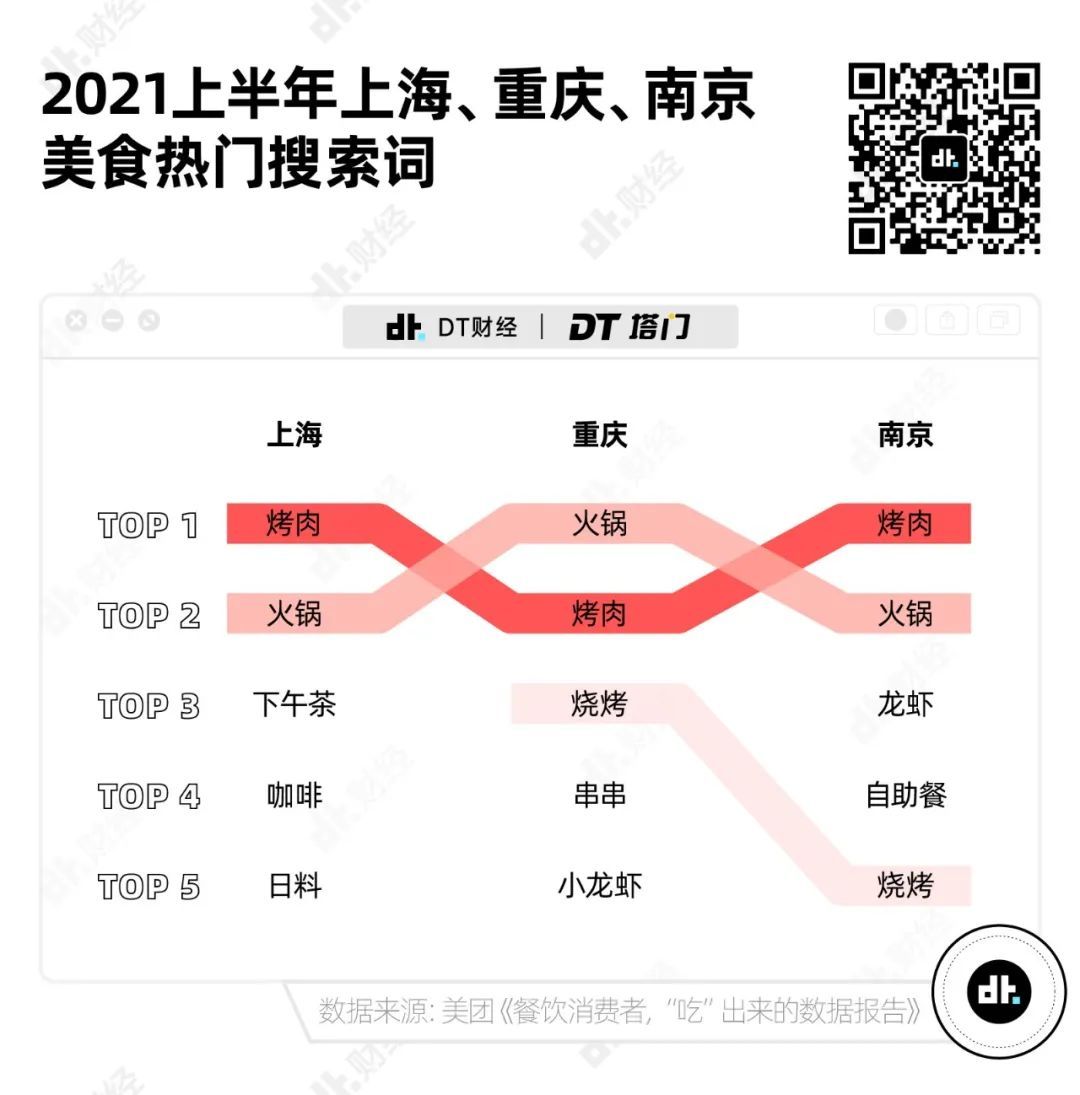 以上海、重庆和南京为例,根据美团数据,2021上半年这三座城市的美食热门搜索词TOP 2都是火锅和烤肉。