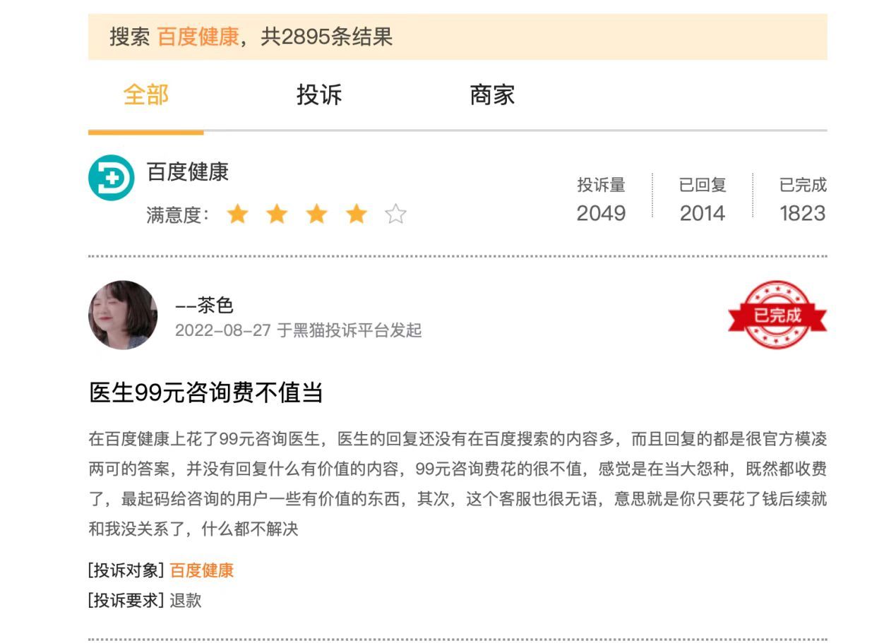 时至今日,在医疗健康赛道上,百度仍然难以重塑自己的信誉,使之变成一个用户可信赖的搜索产品和内容产品。以百度健康为例,从2020年建立以来,关于百度健康付费问诊无回复还不退款、医生冒名注册、职称不实的投诉和报道不在少数,从黑猫投诉平台上,可以看出一二。