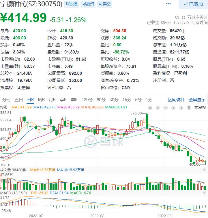 连最致力于吹捧“宁王”的投资人也选择出走。自8月24日股价跳水以来,宁德时代的市值已经被削去20%,重回万亿边缘,截至AI蓝媒汇发稿时,宁德时代报收414.99元/股,市值约为1.01万亿。