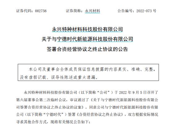 9月5日晚间,能源企业永兴材料发布公告称,董事会同意公司与宁德时代签署《合资经营协议之终止协议》,双方根据实际情况寻求其他合作方式。