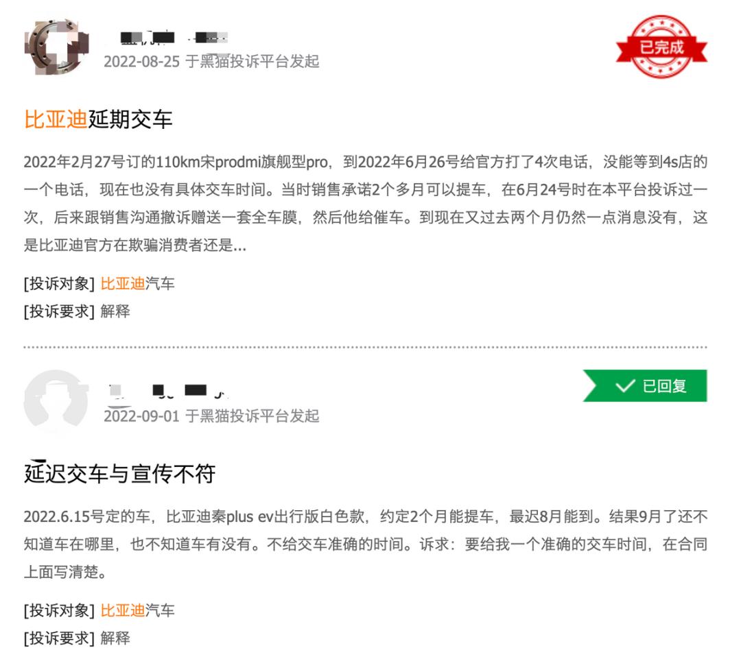 大厂尚且逃不过延期交付的困扰,即便是超头部车企比亚迪,也一度被卷进“超期提车”的舆论。在黑猫投诉平台上,除了零跑汽车外,比亚迪、小鹏汽车、特斯拉均存在类似情况。特别是在黑猫投诉平台,“比亚迪严重超期提车”已引发上千条的投诉。