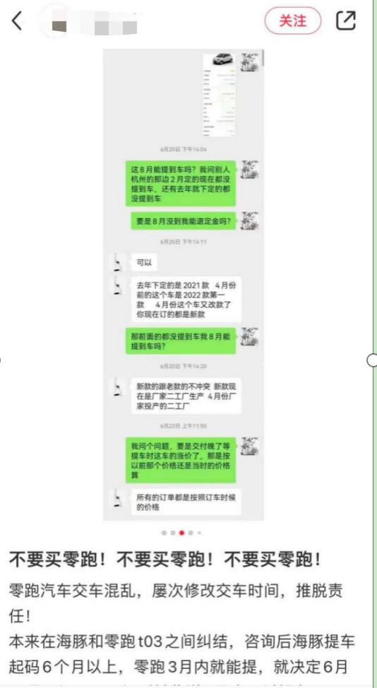 有小红书博主发笔记表示,6月12日下单了零跑T03,当时销售表示8月底可以提车,但等到8月末时,销售又建议其换配置或者颜色;9月初再次通知其提车,但订的车辆从白色变成了粉色。再次询问客服,对方表示,提车时间又延后到了10月底。“我不接受推迟,厂家就把责任推给销售。”
