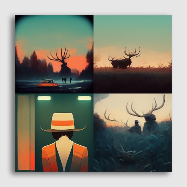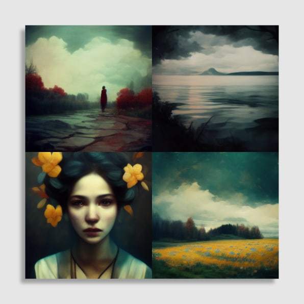 我按照这个命令输入了汤姆·维茨(Tom Waites)一首歌曲的前两句,按了回车键。在一个 2 乘 2 的网格中出现了四个斑点。慢慢地,图像开始扭曲成焦点。几秒钟后,四幅超凡脱俗的图像出现了。我完全被迷住了。