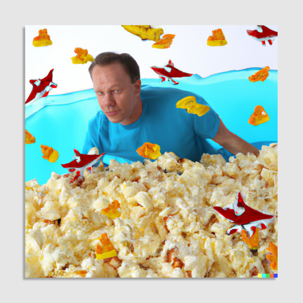 爆米花人在奶酪的海洋中航行,捕猎糖果鲨鱼 [Prompt: courtesy of the author]