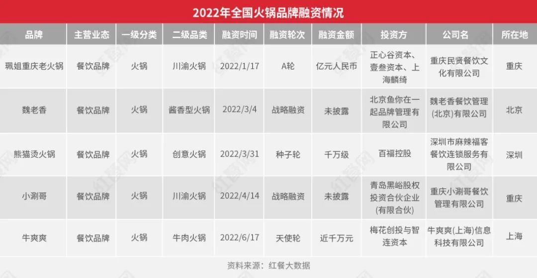 红餐大数据显示,仅今年上半年,火锅赛道就发生了5起投融资事件,珮姐重庆老火锅、熊猫烫火锅、魏老香火锅、小涮哥一人锅、牛爽爽相继获得资本青睐。其中,珮姐重庆老火锅更是拿下了亿元级的融资。