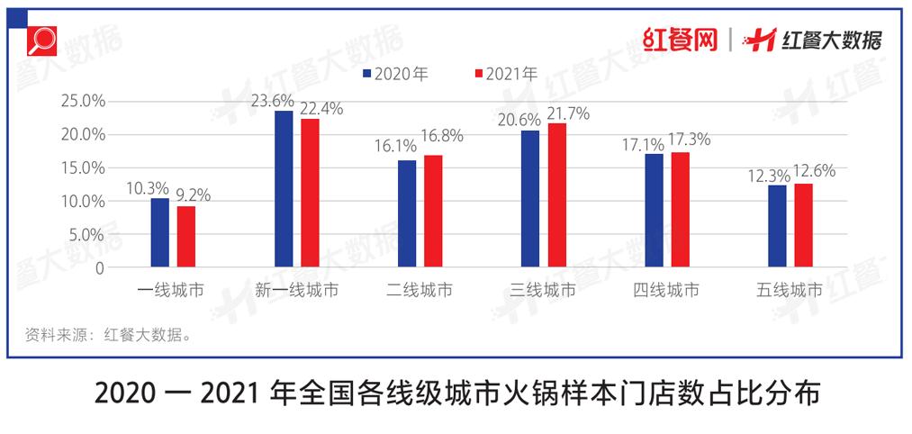 眼下,火锅品牌们也已经正在下沉市场开始有所动作,部分品牌将获客目标从以前的一二线用户下沉到了三四线城市用户。据红餐大数据显示,相比2020年度,2021年三线及以下城市的火锅门店数占比均有所提升,仅三线城市火锅门店数占比从20.6%提升至21.7%。