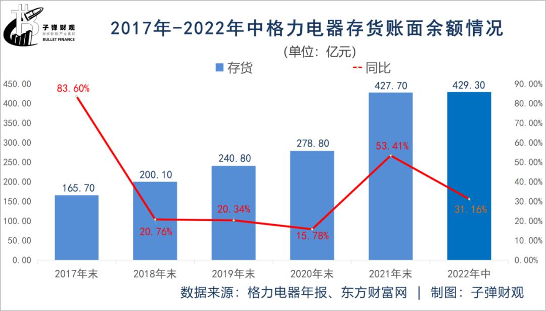 格力2022半年报数据显示:截至2022年6月末,格力的存货余额达429.30亿元,虽相比于2021年末仅增加了1.6亿元,但相比于2021年上半年已经是大增31.16%。