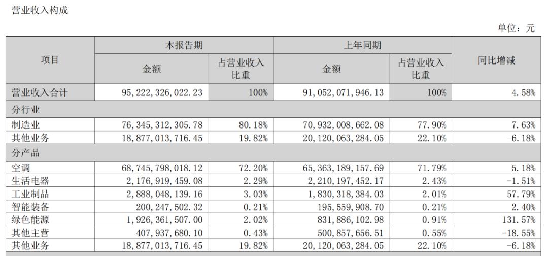 从营业收入的构成来看,2022年上半年,格力952.20亿元的营业收入中制造业占比达80.18%。单一的空调类产品就贡献了72.2%的营收,而生活电器、工业制品和绿色能源等其他产品累计占比才不到7.98%。