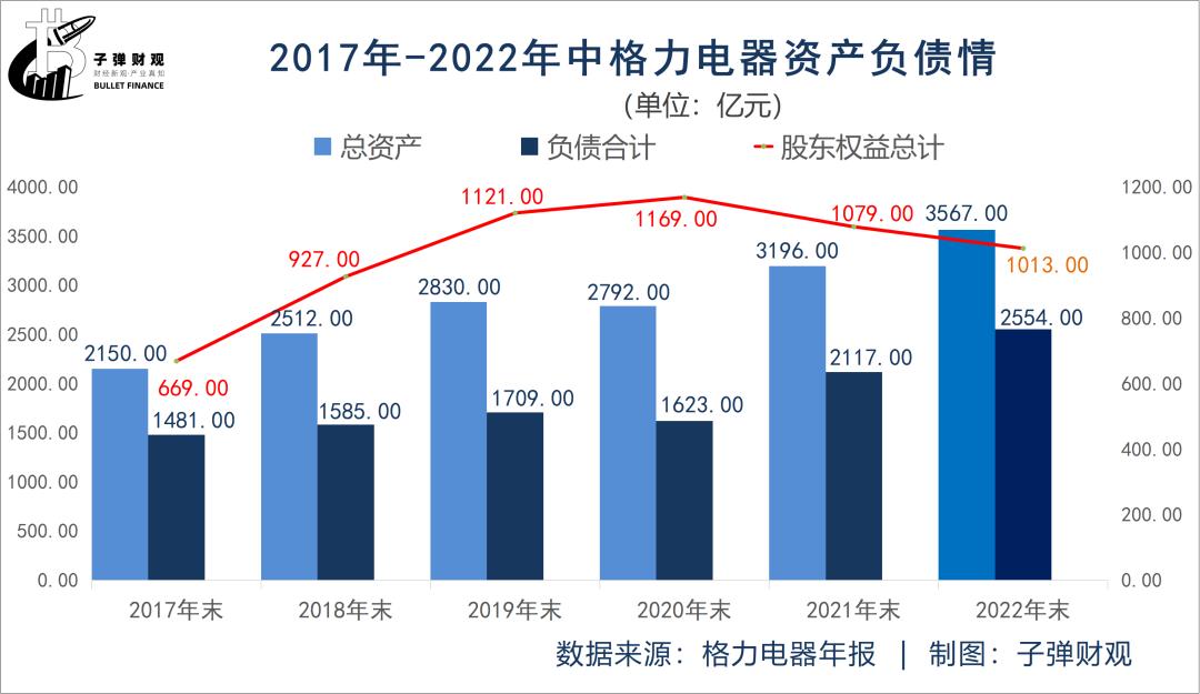 格力2022半年报数据显示:截至2022年6月末,格力资产总计约3567.00亿元,同比增长14.36%,相比于上年末增长11.61%;负债合计约2554.00亿元,同比增长20.53%,相比于上年末增长20.64%;净资产总额约1013.00亿元,同比增长1.30%,相比于上年末减少6.12%。资产负债率也首度达到了71.60%,创历史新高。