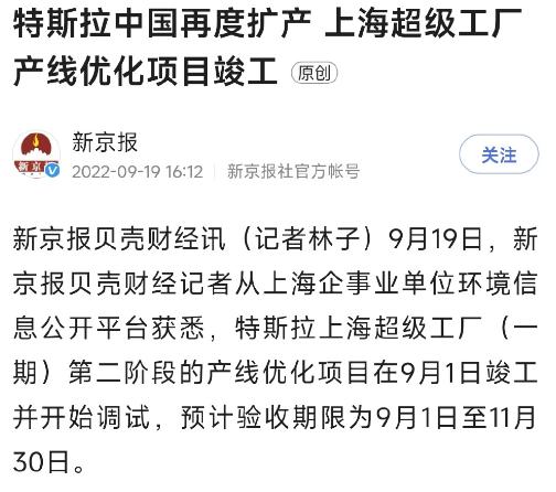 新京报 - 特斯拉中国再度扩产,上海超级工厂产线优化项目竣工。