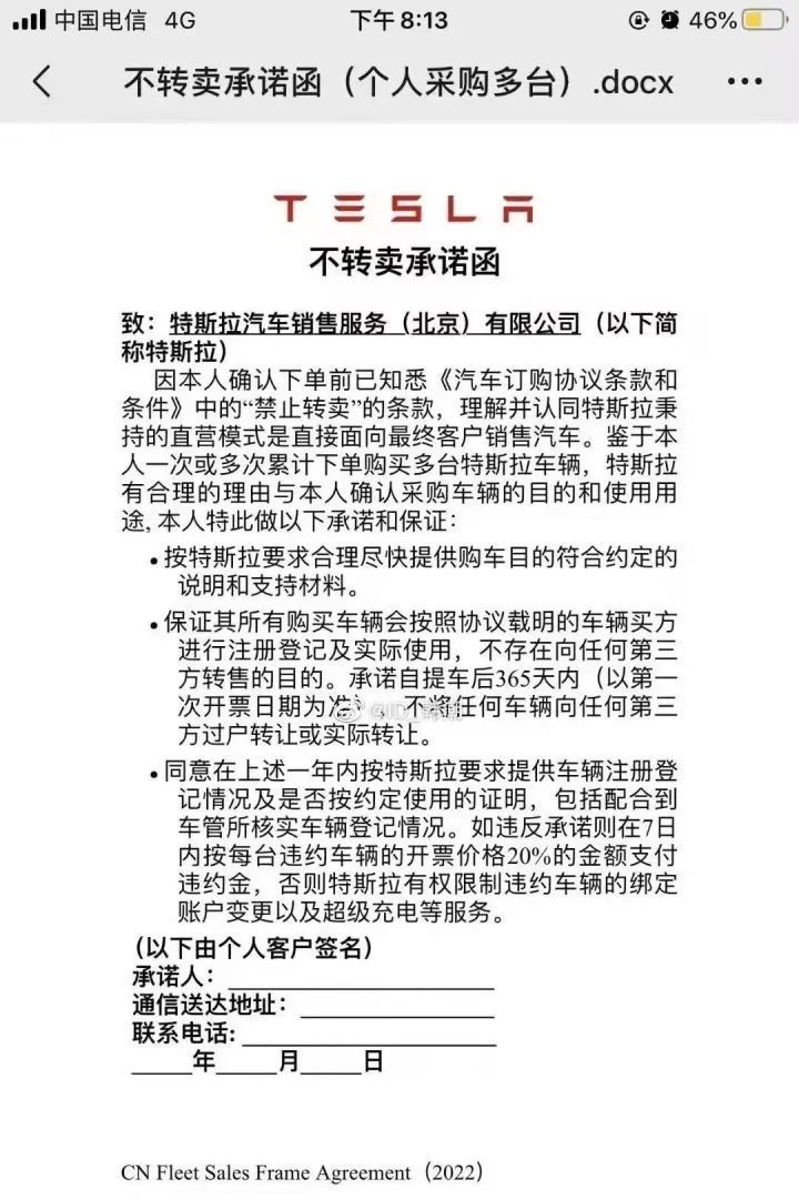 所以网传特斯拉跟车主搞了个《 不转卖订单承诺书 》,要用户一年之内不要过户,否则需要交 20% 的违约金、限制车辆超级充电等附加服务。