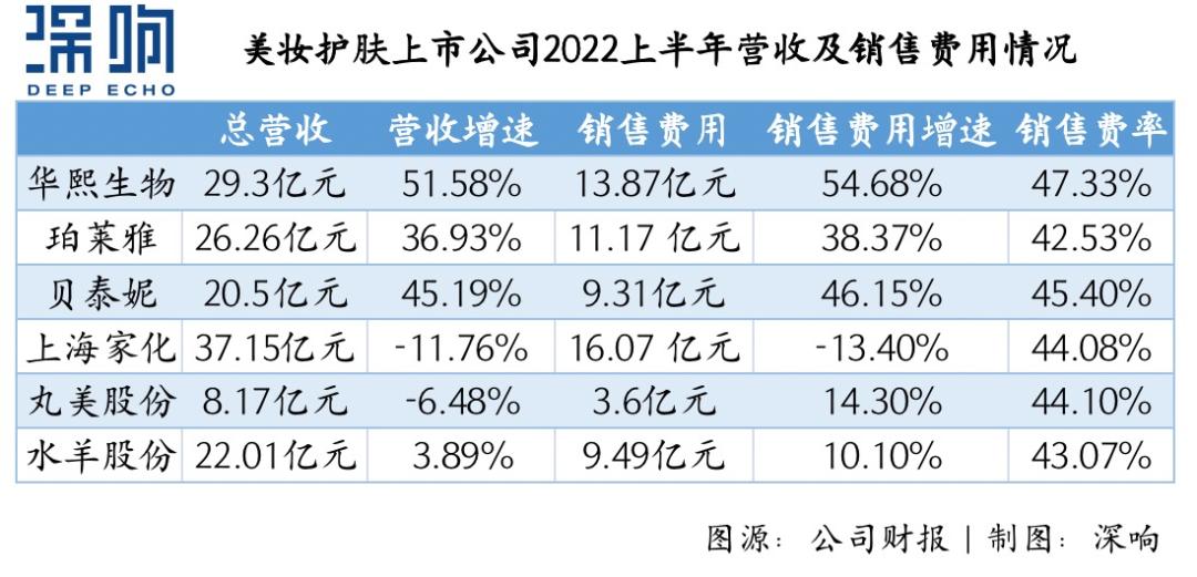 头部美妆护肤上市企业的状况和广告行业的收缩形成鲜明对比。2022上半年,华熙生物销售费用达13.87亿元,同比增长54.68%;珀莱雅销售费用11.17亿元,同比增长38.37%;贝泰妮销售费用9.31亿元,同比增长46.15% 。
