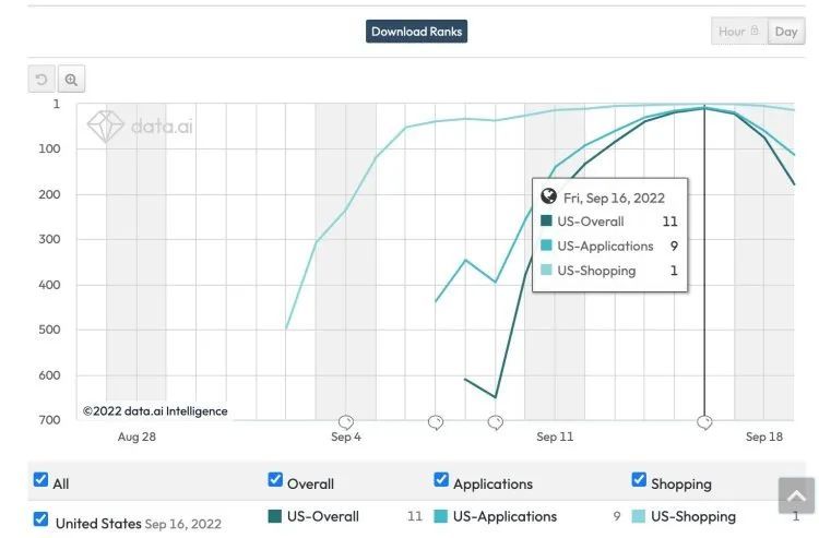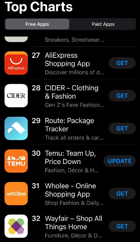 Temu的下载量正在快速上升,截止美东时间9月22日,Temu在App Store的Shopping类别下排30名,超过美国最大的在线家具商城Wayfair和Lululemon。在Google Play商店,Temu更是短暂登顶购物类目第一位。