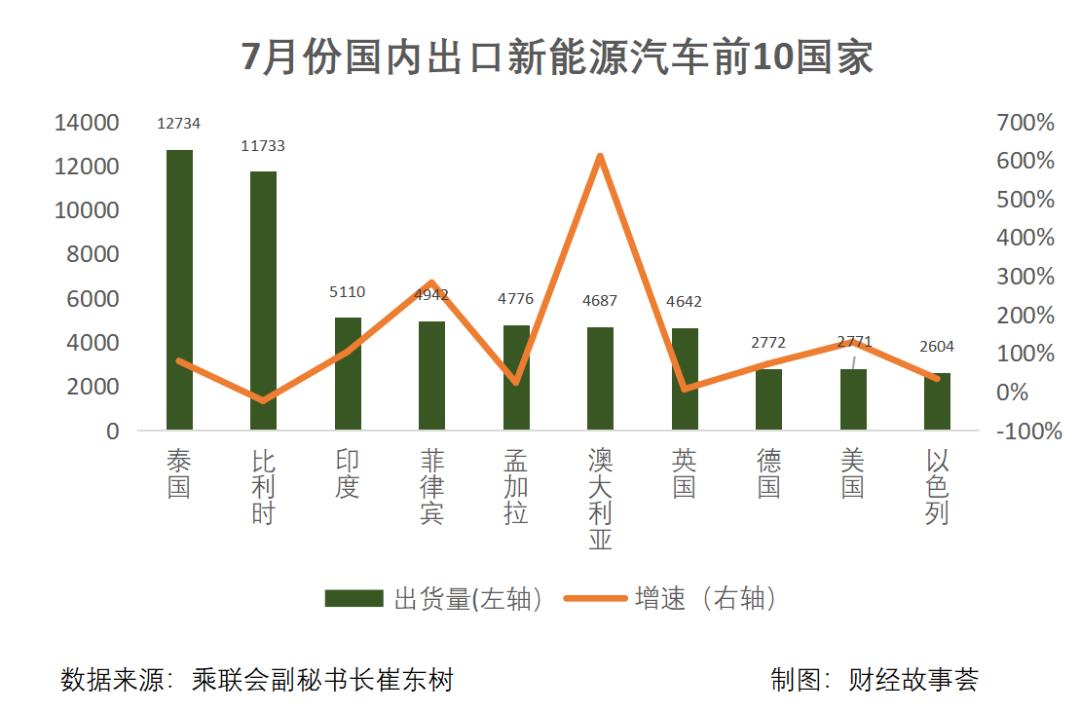 冠军是指国内的新能源汽车在泰国走量。7月份,国内出口泰国的新能源汽车为12734辆,成为国内新能源汽车出海最迅猛的区域;这不是个别月份的特殊情况,2022年1-7月,国内累计向泰国出口51347辆新能源汽车,同比增长244%,成为仅次于比利时的国内第二大新能源汽车出口国。