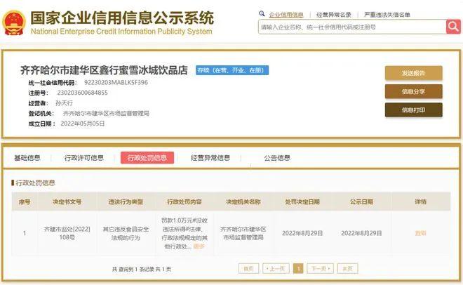 实际上,蜜雪冰城多次因为食品安全问题上热搜。最近的新闻是,齐齐哈尔市建华区鑫行蜜雪冰城饮品店因违反食品安全法规,被齐齐哈尔市建华区市场监督管理局罚款1万元。违法事实显示,消费者在该店购买的两杯冰鲜柠檬水中发现有虫状异物。