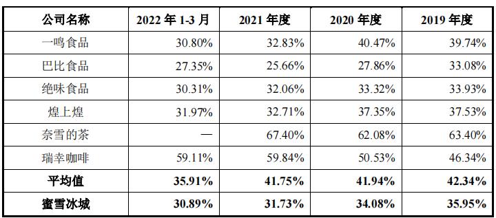 依靠低价,蜜雪冰城在下沉市场打开了一片天地。但与此同时,蜜雪冰城也会陷入“薄利多销”的固有逻辑,难以做出较高的品牌溢价。招股书显示,蜜雪冰城2019-2021年的毛利率分别为35.95%、34.08%、31.73%,只有同行奈雪的茶的一半左右,且呈现逐渐下滑的状态。