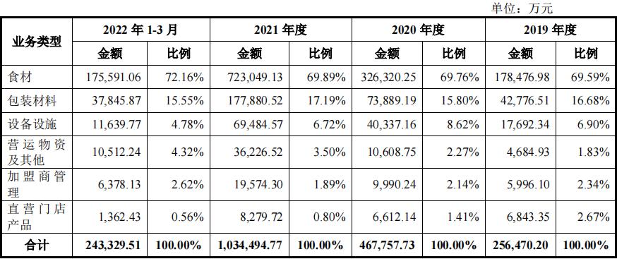 本质上,蜜雪冰城不是一家奶茶店品牌,其实是一家原料供应商。蜜雪冰城的的赚钱之道是:把食材、包装材料、设备设施及营运物资等产品卖给加盟商。招股书显示,食材是蜜雪冰城最主要的收入来源,营收占比稳定在70%左右,2022年1至3月仅向加盟商销售食材就取得17.56亿元收入,贡献了72%的营收。第二大收入来源于包装材料,营收占比在15%至17%浮动。