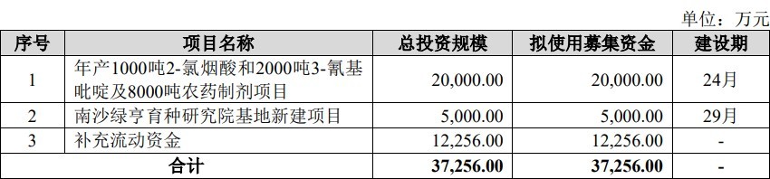 IPO募资方面,根据招股书显示,本次公司拟募资3.72亿元,资金将用于年产1000吨2-氯烟酸和2000吨3-氰基吡啶及8000吨农药制剂项目、南沙绿亨育种研究院基地新建项目。