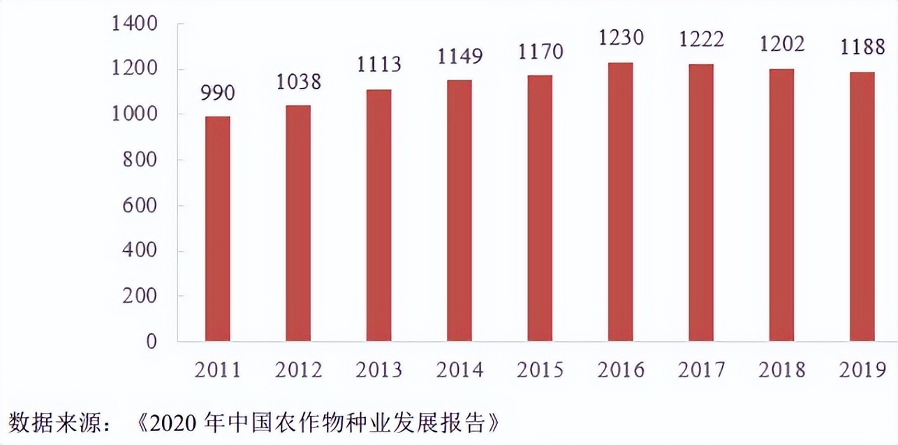 市场规模方面,根据2020年中国农作物种业发展报告数据显示,2011年-2019年,我国种业市场规模从990亿元增长至1188亿元,年均复合增长率为2.31%。
