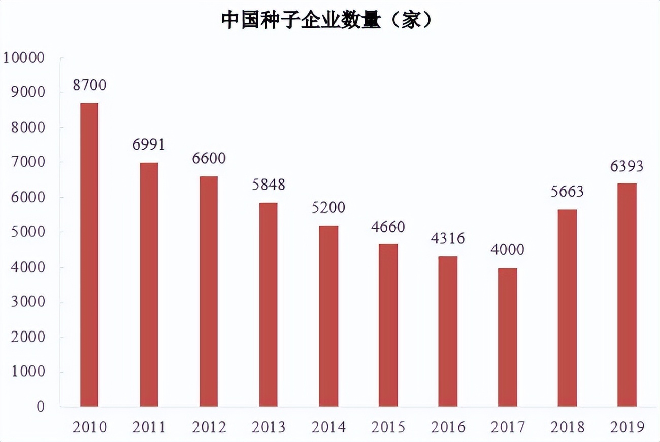 为规范种子行业,国务院先后发布了《国务院关于加快推进现代农作物种业发展的意见》《全国现代农作物种业发展规划(2012-2020 年)》等指导意见与规划,提高种业进入门槛,加强种子市场监管。根据2020年中国农作物种业发展报告数据显示,截至2019年末,持有有效种子生产经营许可证的企业数为6393家,相比2010年的8700家减少了26.52%,种业龙头的产品成为市场主流,行业集中度提高。