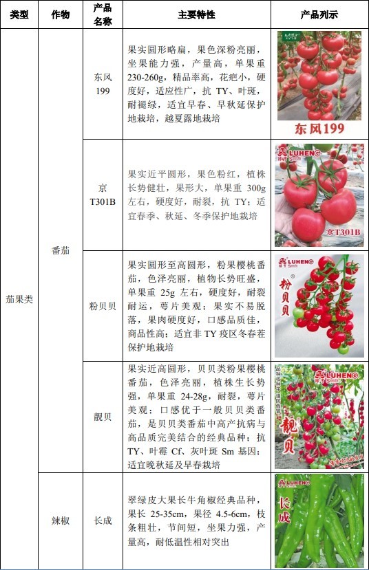 在种业方面,公司拥有种子专利10项,农作物审定品种14项,农作物登记品种 138项,植物新品种权19项。其中,公司出品的“东风199”毛粉番茄、“圣桃 6号”小番茄、“亨椒50”泡椒、 “黄剑26”牛角椒、“天秀201”茄子、“中农甜808”鲜食玉米等种子被各地种业协会认定为推荐品种。