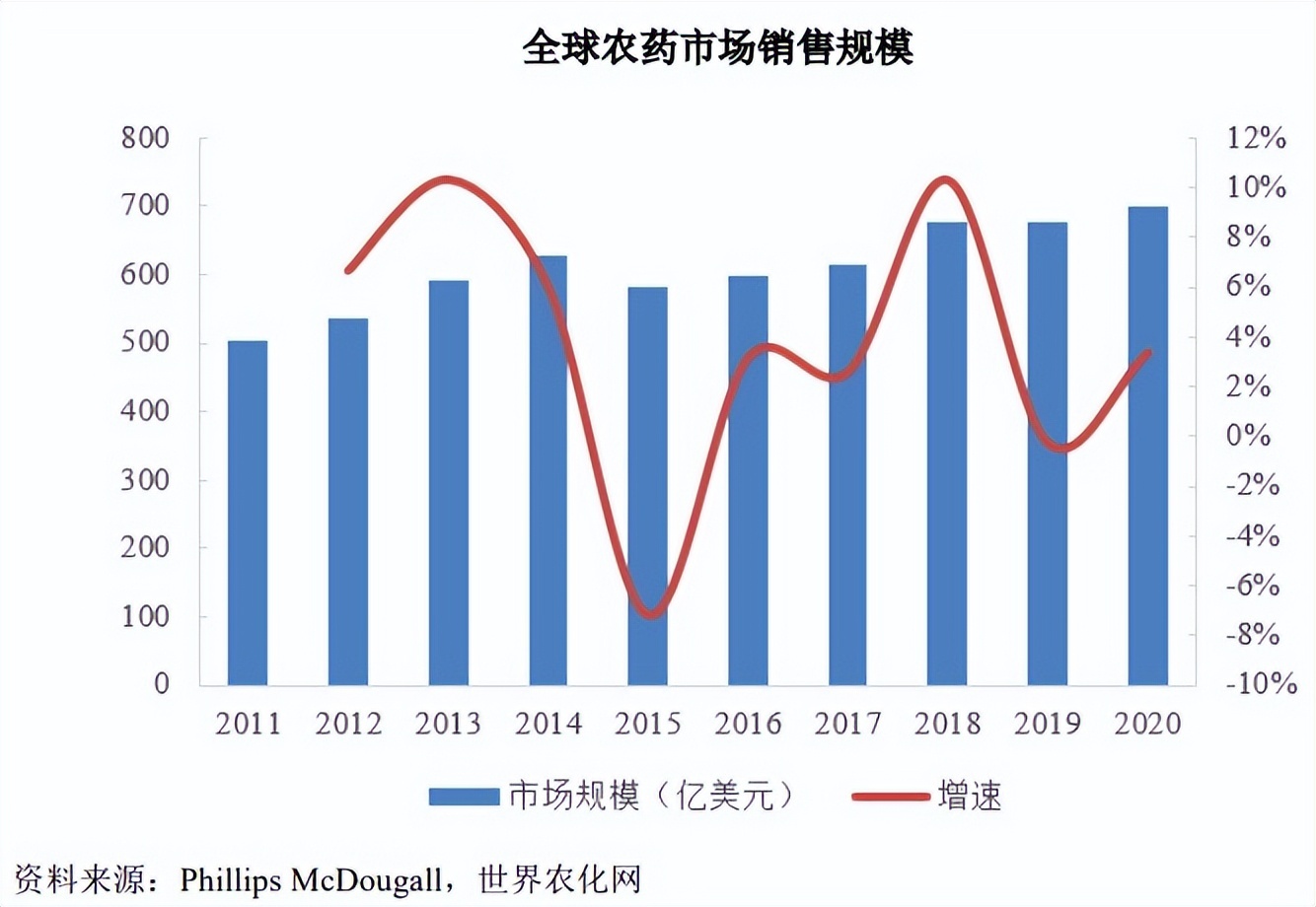 从行业市场规模来看,自2016年起,全球农药市场重回上升通道,2020年全球农药市场销售额为698.86亿美元,同比增长2.47%。其中,作物农药市场的销售额为620.36亿美元,同比增长2.71%。根据Phillips McDougall预计,2023年全球作物农药市场需求将达到667.03亿美元,2020年-2023年全球作物农药市场将保持2.4%以上的增速发展。