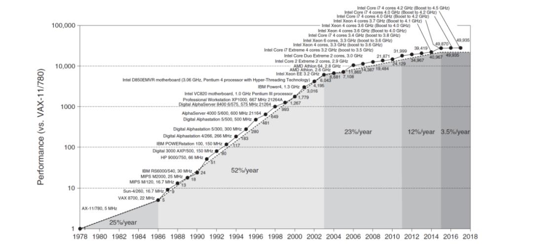 从80年代中期到本世纪初,根据Patterson和Hennessy的统计,CPU单核性能的年均增长率达到了52%。但从本世纪初开始,由于功耗限制和内存延迟等原因, CPU的单核性能增 速开始大滑坡,年均性能提升逐渐降至3.5%。