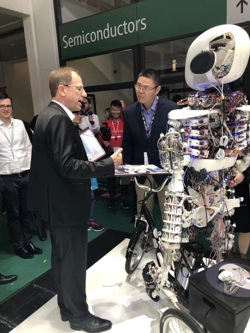 2018年慕尼黑电子展,丁险峰(右)和英飞凌CEO Reinhard Ploss(左)交流如何用“AI+传感器”做人形机器人