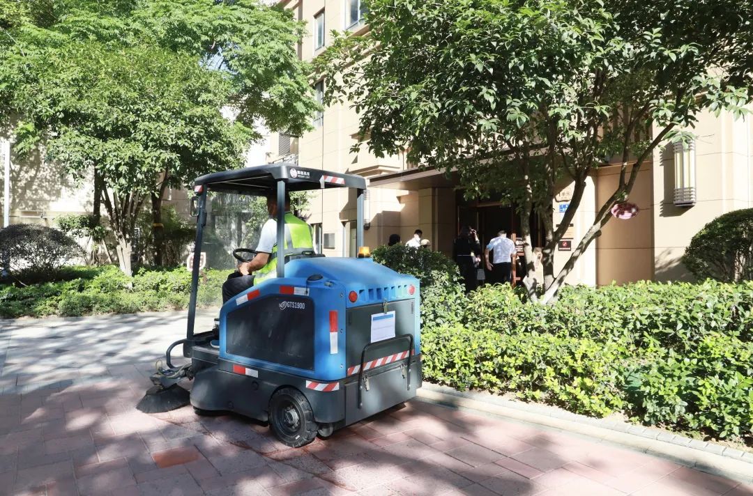 2022年7月,在武汉唐家墩街道“蝶城”内,一名保洁人员开着清洁机打扫小路,直接提升其工作效率