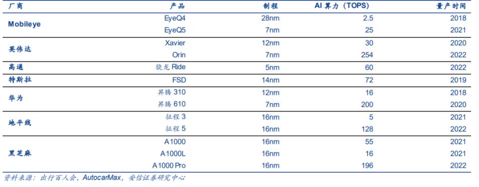2020年英伟达推出了算力达到256TOPS的Ornio芯片,该芯片于今年3月开始量产,蔚来、理想、小鹏等在2022年上市的旗舰高端车型,搭载的芯片都是这款芯片。