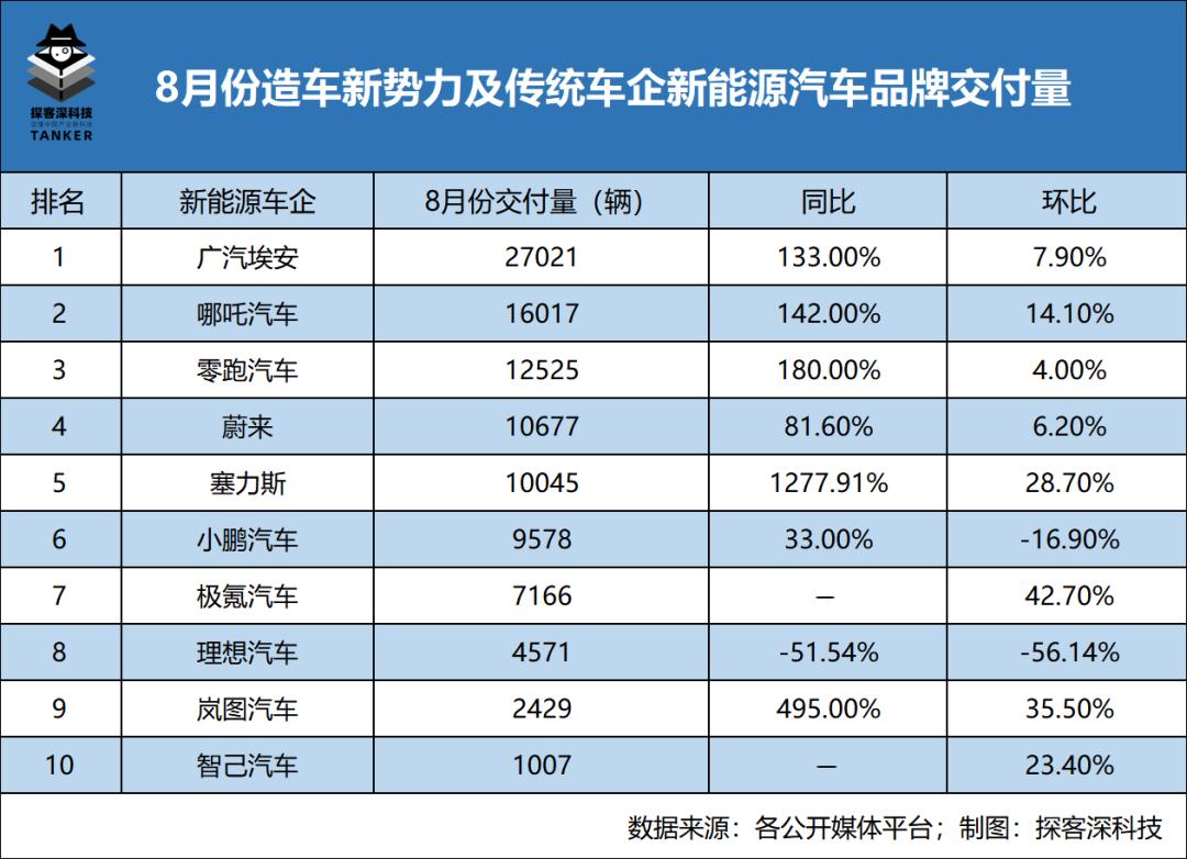 事实的确如此,8月份,岚图汽车交付量连续3个月持续回升;智己汽车加入了交付量排行榜,旗下首款车型交付量破千;塞力斯与华为联合打造的AITO问界系列、极氪汽车则继续保持高速增长状态。