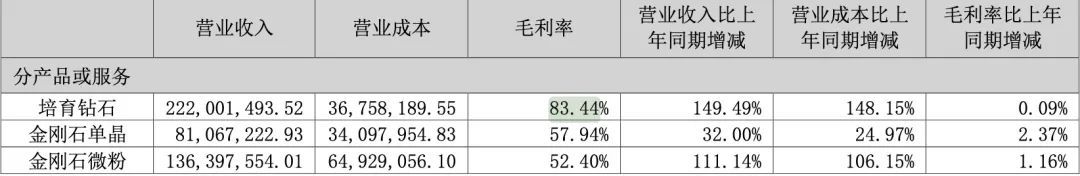 以力量钻石为例。其2022年半年报显示,上半年公司实现营业收入4.48亿元,同比增长105.14%;归属于上市公司股东的净利润2.39亿元,同比增长121.39%。据财报,培育钻石业务已成力量钻石第一收入来源,毛利率高达83.44%。